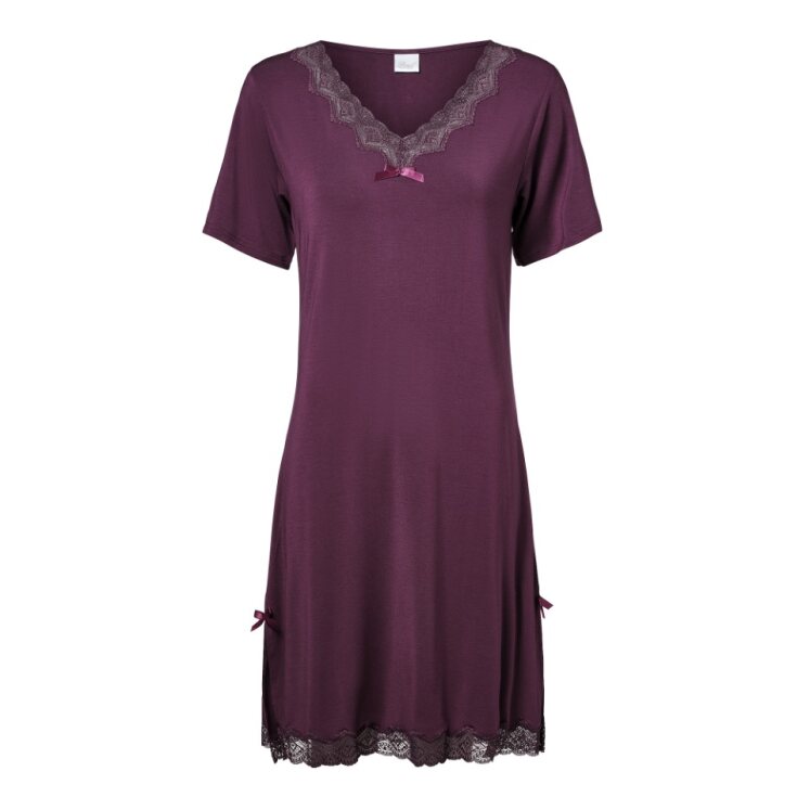 Favoritten blant mange. Nattkjole med korte ermer og V-hals i herlige modal- og med blondedetaljer. Perfekt nattkjole både hjemme og på farten. Blondekledd splitt på 21 cm på begge sider. Farge: Purple Rain